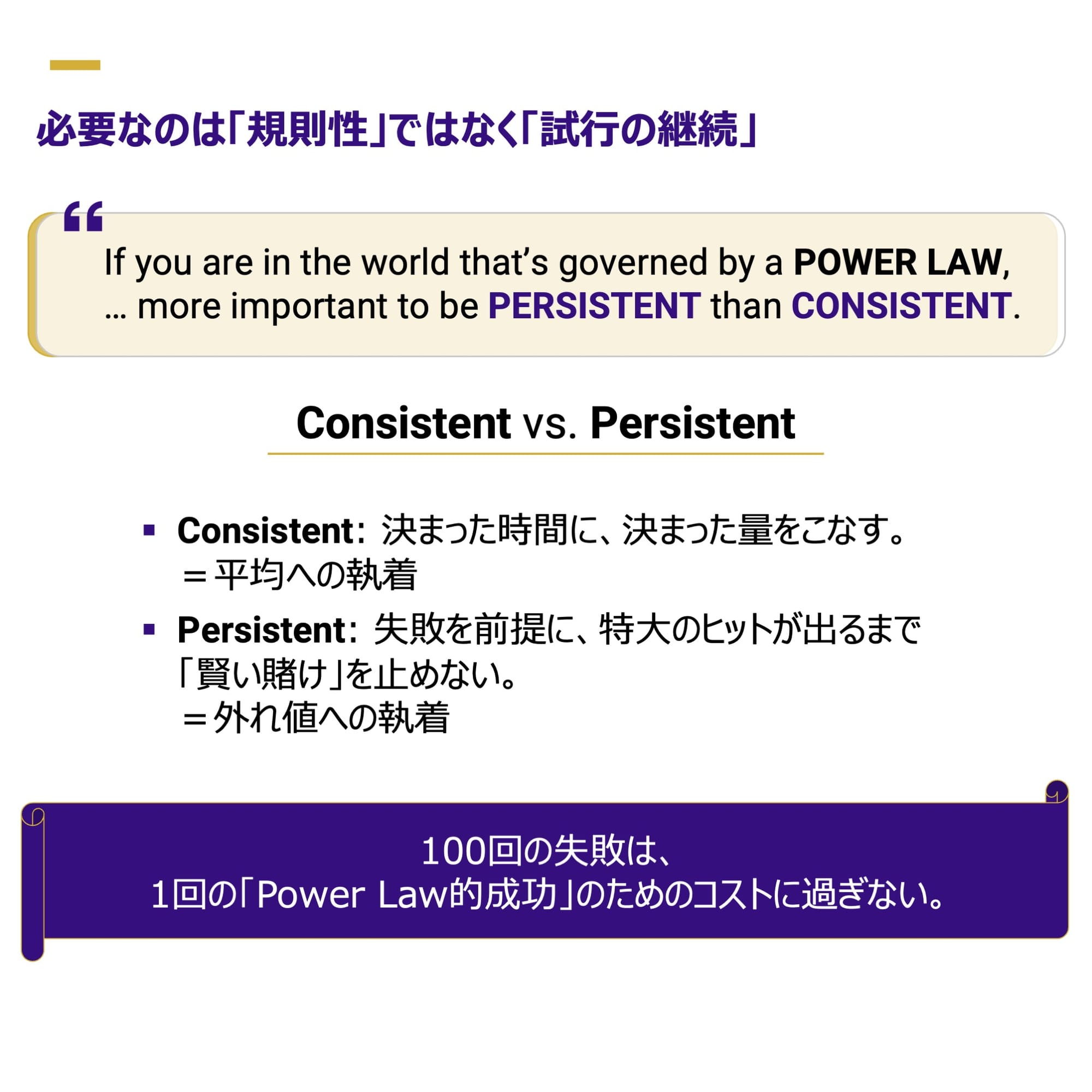 If you are in the world that's governed by a power law, ... it becomes more important to be persistent than consistent.