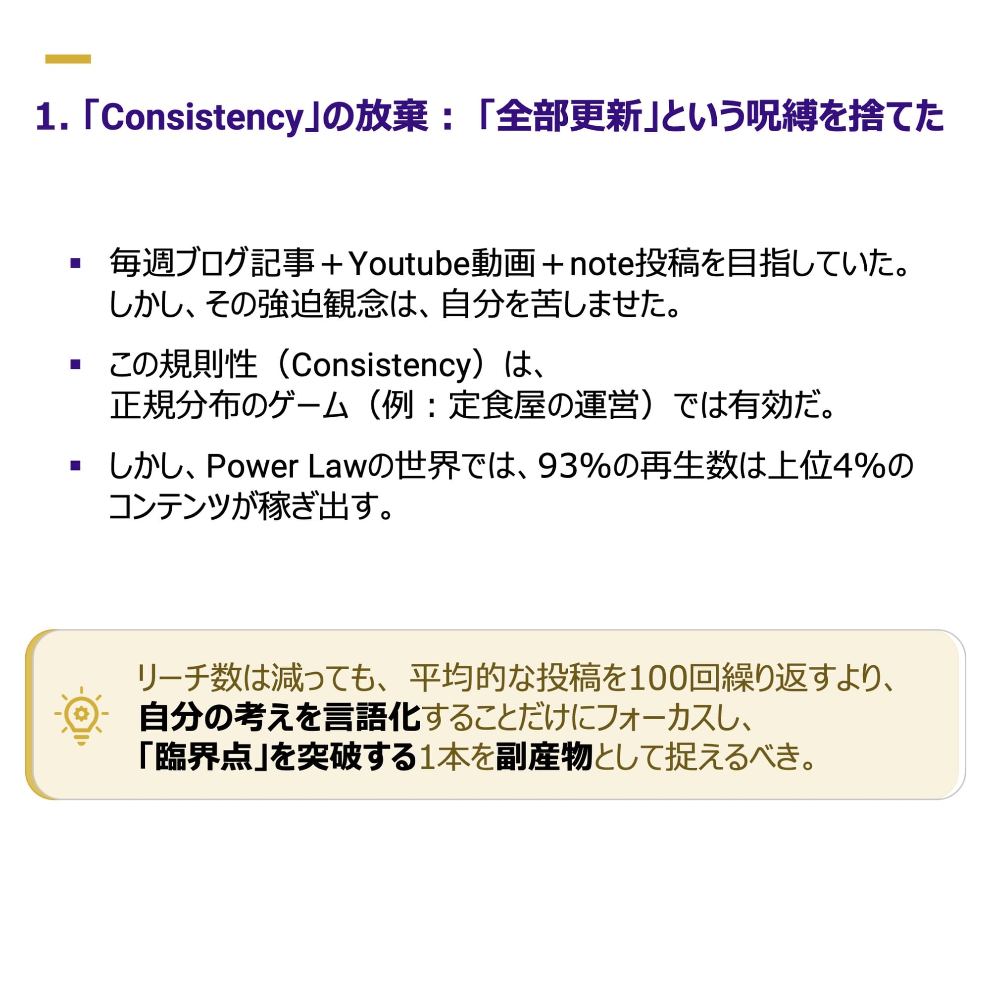 毎日同じ時間に投稿する規則性(Consistent)は、正規分布のゲーム(例:定食屋の運営)では有効だ。しかし、Power Lawの世界では、93%の再生数は上位4%の動画が稼ぎ出す。