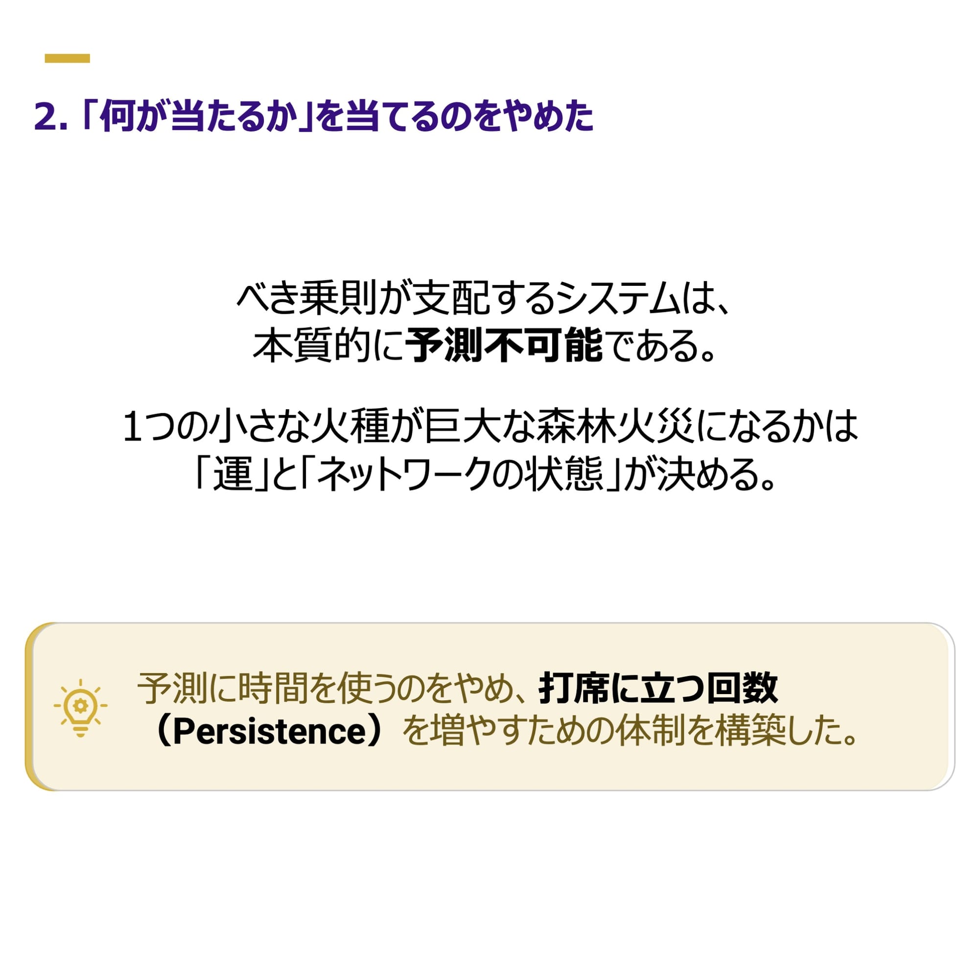 私たちが生きるビジネスの世界は、平均が支配する「正規分布」ではなく、一握りの外れ値が全てをさらう「べき乗則(Power Law)」の世界だからです。