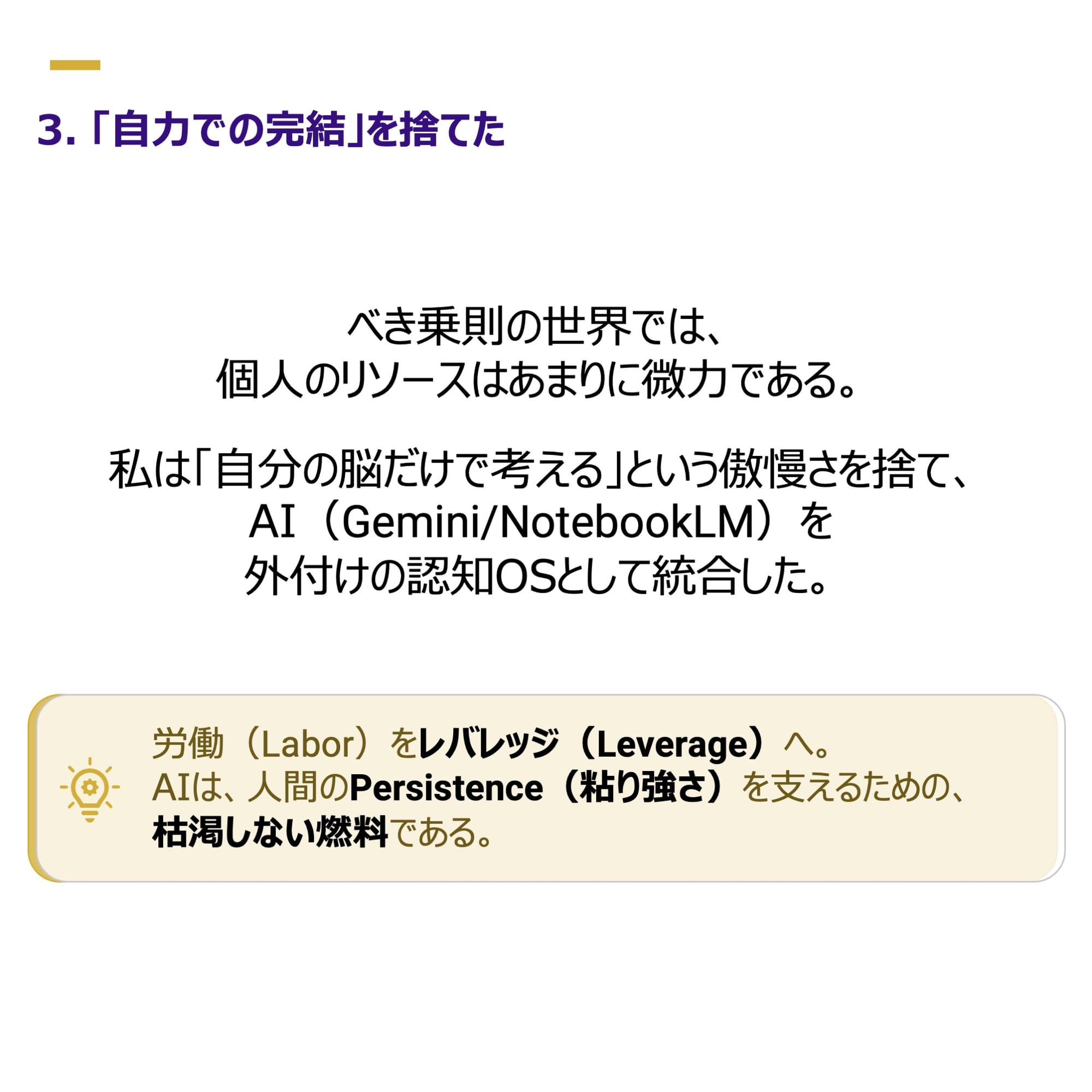 べき乗則の世界では、個人のリソースはあまりに微力である。私は「自分の脳だけで考える」という傲慢さを捨て、AI(Gemini/NotebookLM)を外付けの認知OSとして統合した。